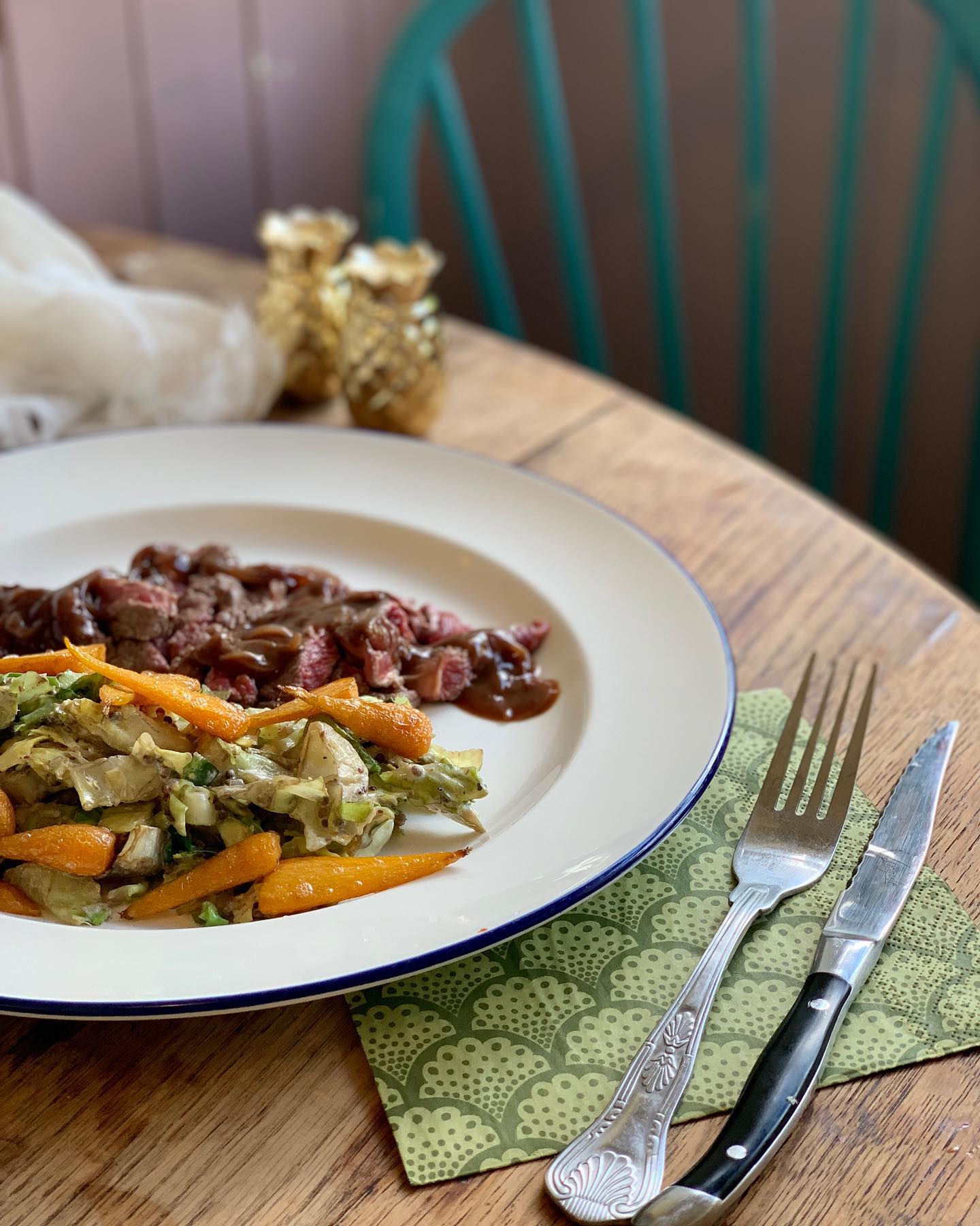 Rump steak in a red wine glaze, with creamy mustard spring greens and chantenay carrots - 601 calories, 17g carbs and 38g protein